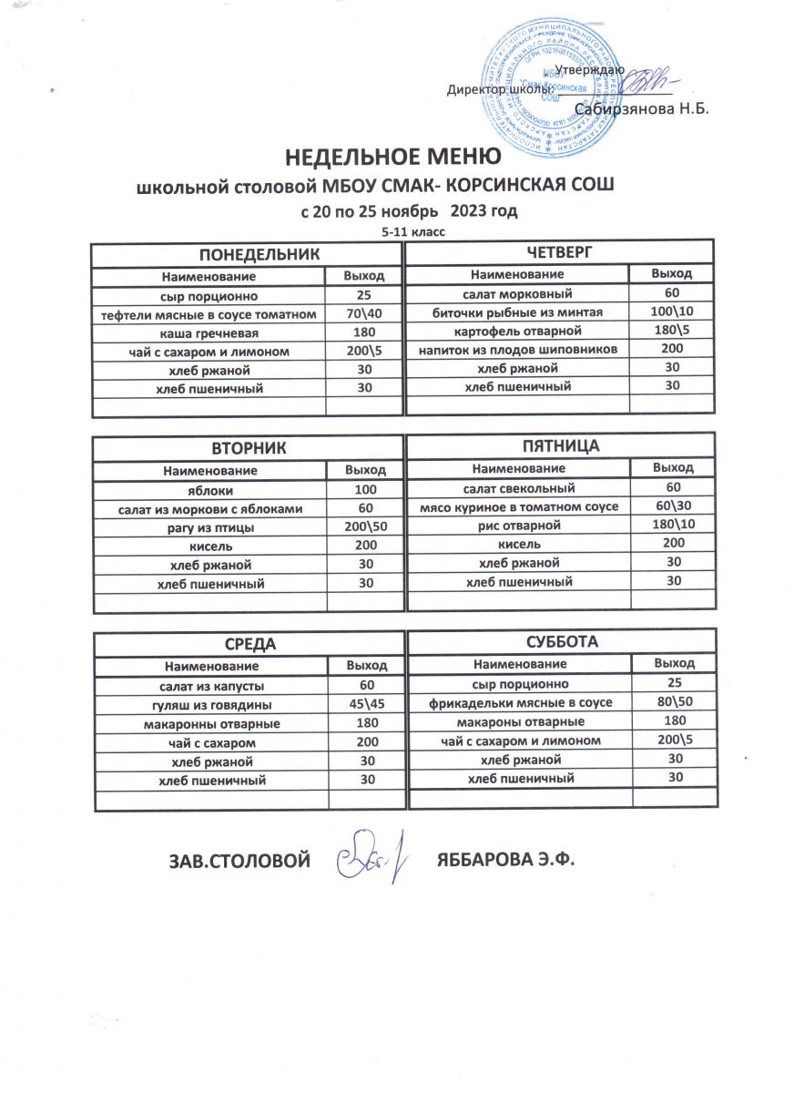 Меню на 20 ноября - 25 ноября 2023 года для 5-11 классов