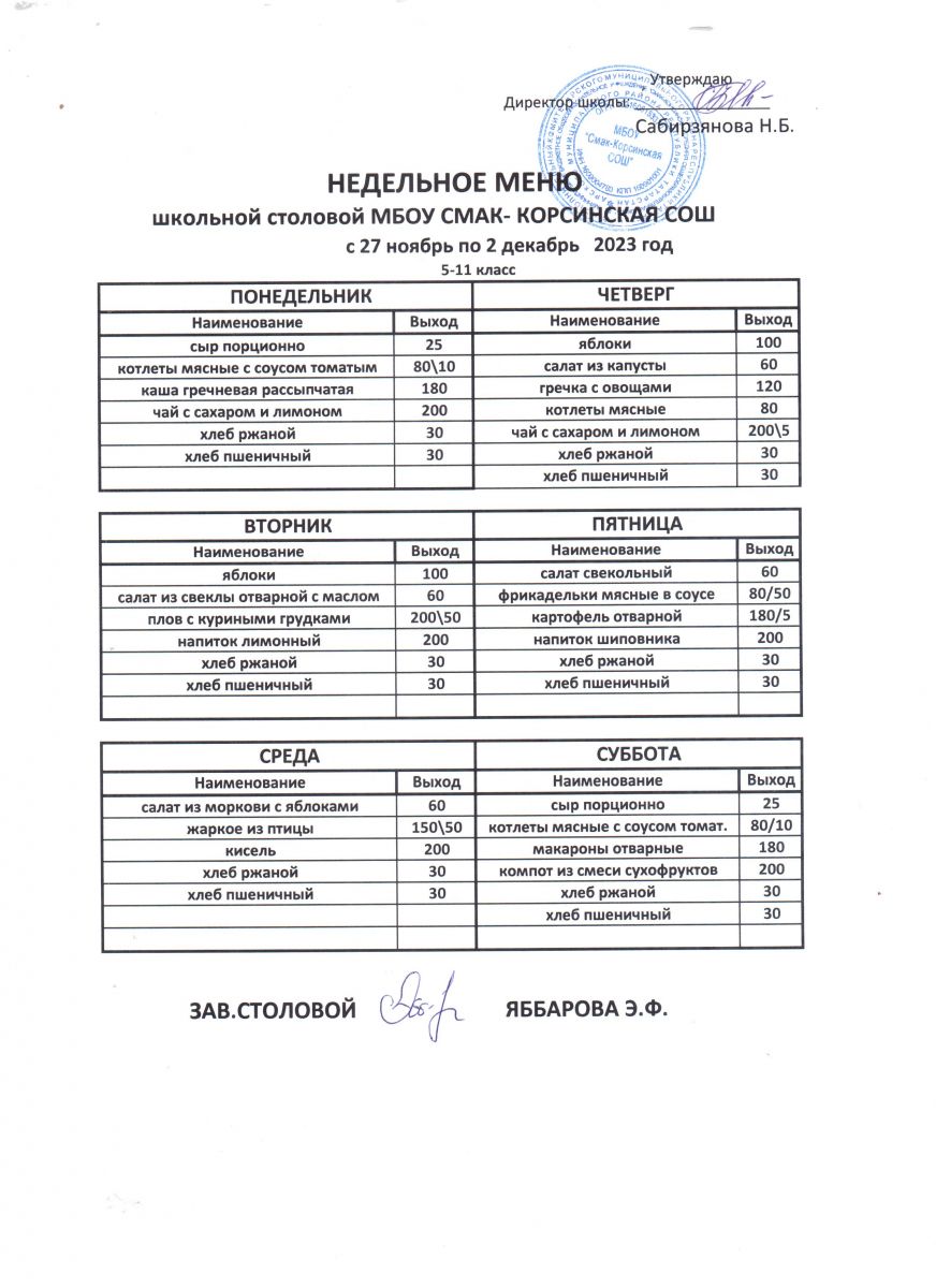 Меню на 27 ноября - 2 декабря 2023 года для 5-11 классов