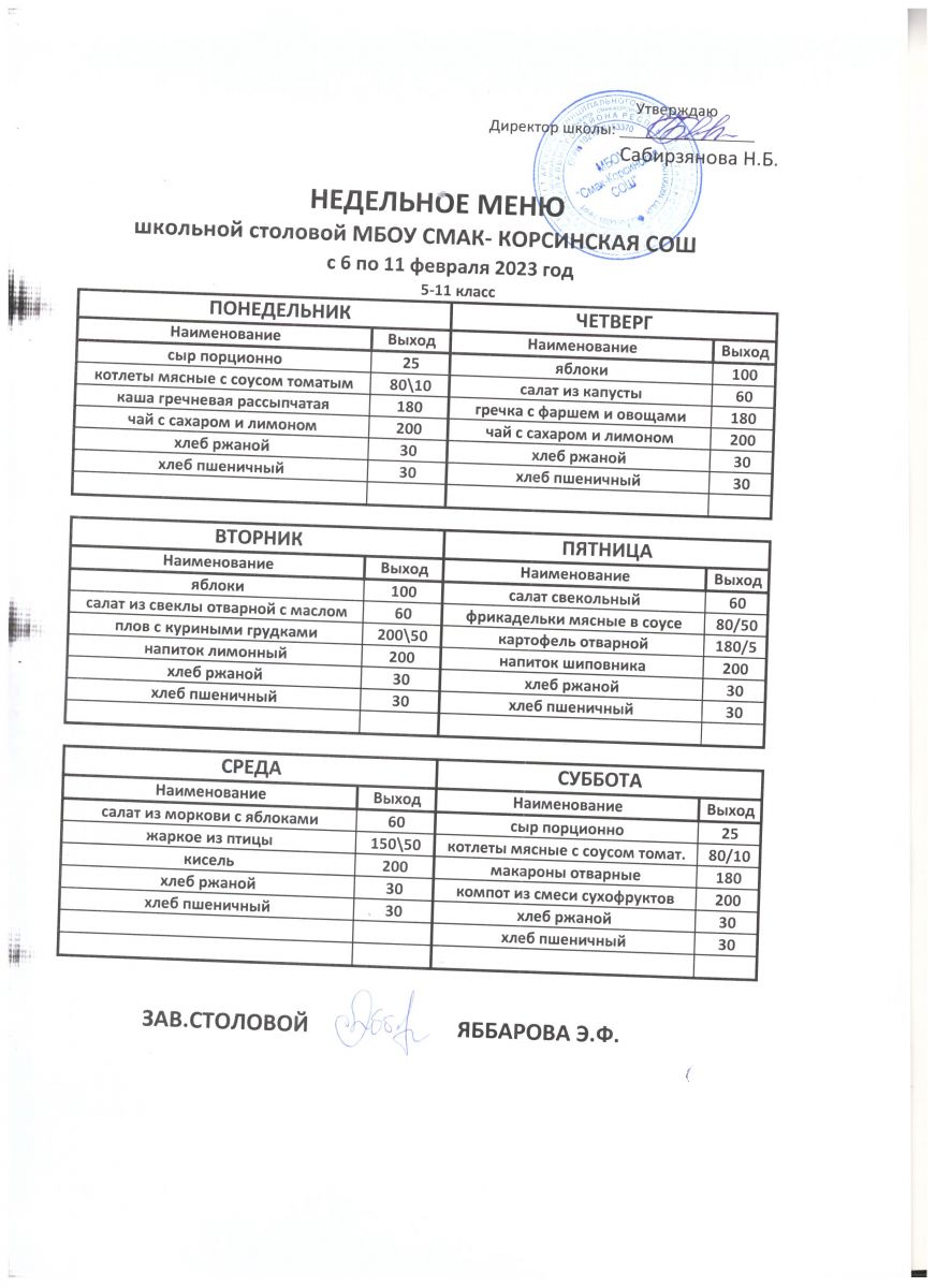 Меню на 6 февраля - 11 февраля 2023 года для 5 - 11 классов