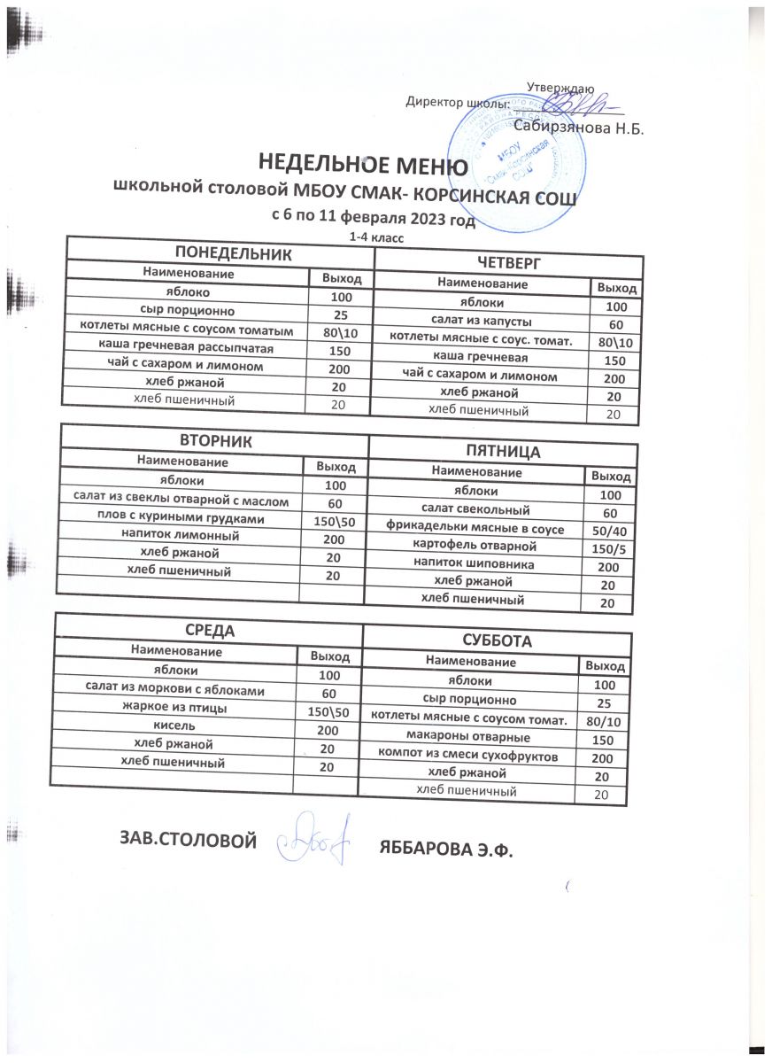 Меню на 6 февраля - 11 февраля 2023 года для 1 - 4 классов
