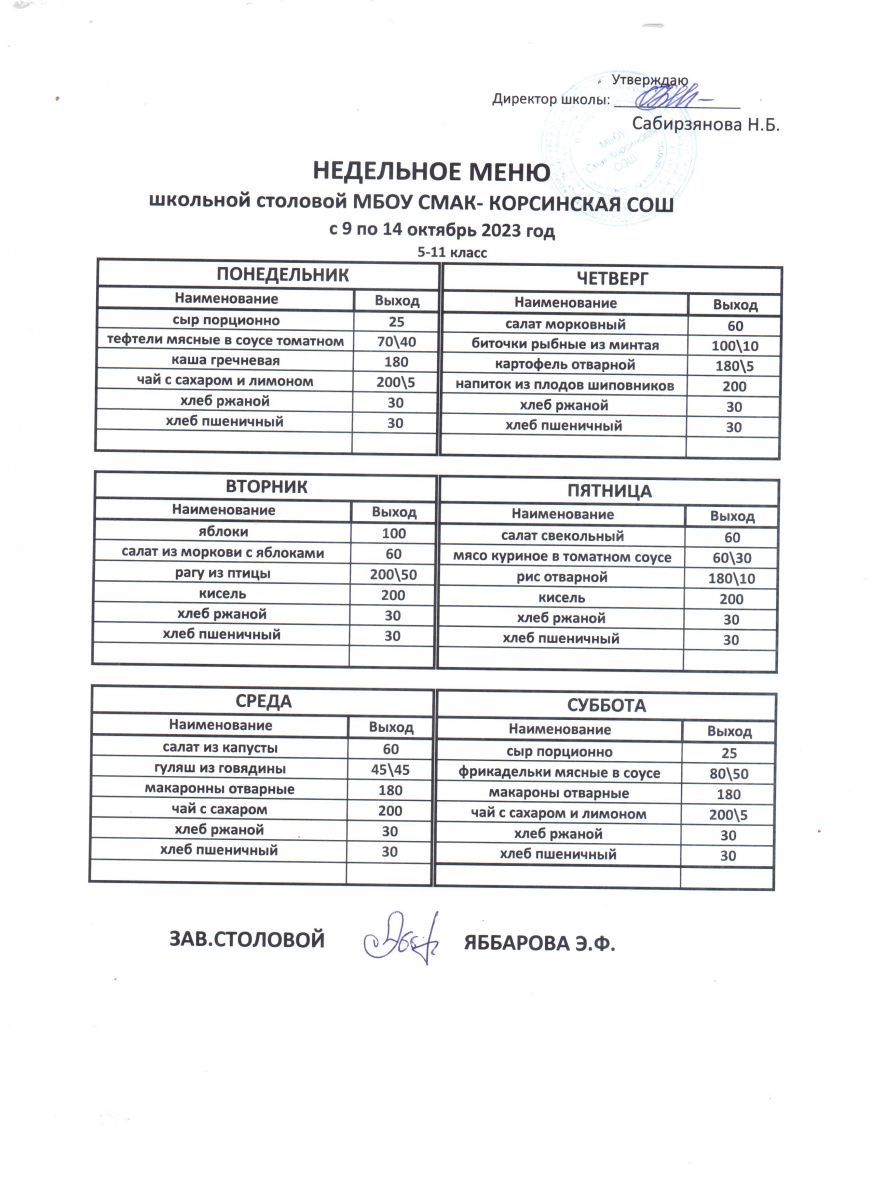 Меню на 9октября - 14 октября 2023 года для 5-11классов