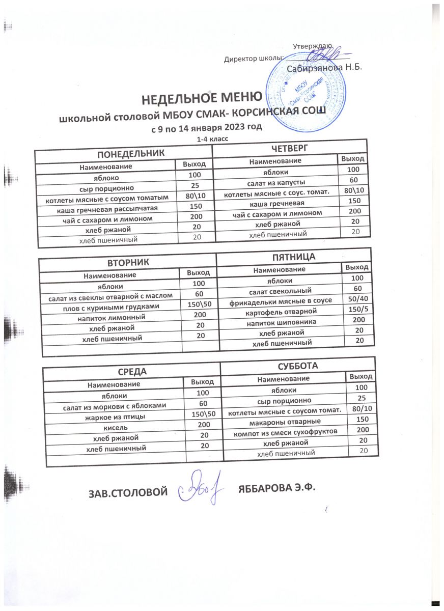 Меню на 9 января - 14 января 2023 года для 1 - 4 классов