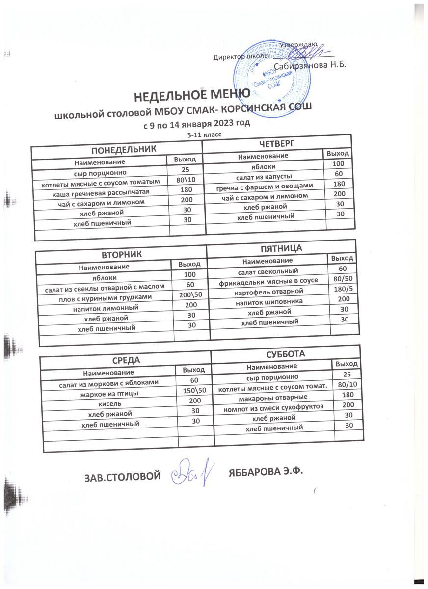 Меню на 9 января - 14 января 2023 года для 5 - 11 классов