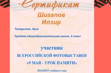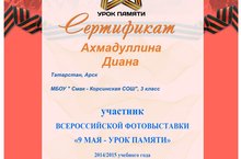 " 9 май- хәтер дәресе" исемендәге фотоконкурста актив катнашып, рейтинг буенча 1 урынны алган 3 класс укучысы Әхмәдуллина Диана сертификат белән бүләкләнде. Җитәкчесе Әхмәдуллина Г.И.