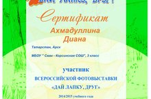 Ученица 3 класса Ахмадуллина Диана участвовала в фотоконкурсе " Дай лапку, друг". Наставник Ахмадуллина Г.И.