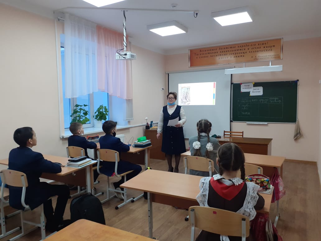 5 нче сыйныфлар өчен "Татар халкының милли киемнәре"" исемле класс сәгате узды.Класс сәгатенең максаты : милли киемнәребездә чәчәк һәм үсемлек мотивлары, орнамент турында төшенчә бирү,милли мәдәнияткә ихтирам һәм мәхәббәт хисе тәрбияләү. Класс җитәкчесе үзенең чыгышында татар халкының милли киемнәренең үзенчәлеге турында сөйләде. Түбәтәй, калфак, читек турында чыгышлар тыңланылды, Физкультминут вакытында татар биюе башкарылды. Балалар , 2 төркемгә бүленеп, татар халкының милли киеме - түбәтәй һәм читек элементлары өстендә эшләделәр, аннары эшләрен якладылар. . Рефлексив бәяләү өлешендә костюмнарның төп элементларын санадылар, орнаментларда кулланылган чәчәк исемнәрен санадылар.