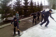 Бүген тирә-юньне кардан чистарту максатыннан, укучылар һәм укытучылар өмәгә чыктык. Тизрәк мәктәп тирәсен кардан арындырып, мәктәбебез территориясе балкып утырса иде. Тиздән җир арчылыр, язгы эшләр башланыр.