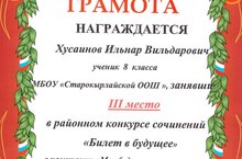 Арча мәшгульлек үзәге уздырган "Киләчәккә " сочинениеләр конкурсының "Минем киләчәгем - минем кулларда" номинациясендә 8 класс укучысы Хөсәенов Илнар "Киләчәгең үз кулыңда" шигыре белән 3 урынга лаек дип табылды, грамота белән бүләкләнде.