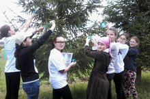 Бүген без балалар белән авылыбыз янында урнашкан алма бакчасына килдек. Анда алмагачлар шау чәчәккә күмелгәннәр. Чәчәкләрнең хуш исен иснәп, хәрәкәтле уеннар уйнадык.
