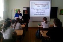 Бүген, 14 нче февраль көнне, 7- 9 класс укучылары белән берлектә " Татарстан 2030: мой вклад в будущее республики" темасы астында Парламент дәресе - 2017 үткәрелде. Парламент дәресендә Район Советы депутаты Гыйлаҗетдинова Айсинә Рәфкать кызы катнашты. Җәмгыять белеме укытучысы Хәбибуллина Гөлназ Галимҗан кызы укучыларны дәүләт парламентаризмы, Россия Федерациясе һәм Татарстан Республикасының хакимият органнары белән таныштырды. Аннан соң укучылар үзләрен кызыксындырган сорауларга җаваплар тыңладылар. Киләчәктә республика үсеше өчен ныклы нигез - ныклы белемнәр дигән нәтиҗәгә килделәр.