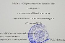 Воспитанник нашего детского сада принял участие в муниципальном вокальном конкурсе "Голосок - 2020" и стал победителем в номинации "Юный вокалист". Поздравляем нашу маленькую звездочку! Желаем творческих побед и новых достижений!