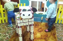 Без бүген балалар белән занятияләрдән соң бушаган сөт каробкаларыннан " Нәни бозау " ясадык. Безнең максат: әзер формалардан ябыштырып бозау образы ясау иде, балаларны күмәк эш белән кызыксындыру, тәрбиячегә ярдәм итү теләге булдыру һәм балаларны пөхтәлеккә өйрәтү, үз- үзләренә ышаныч теләге тәрбияләү иде. Без узебезнең максатыбызга ирештек.. Безнең күмәк эштән менә шушындый " Нәни бозау" килеп чыкты.