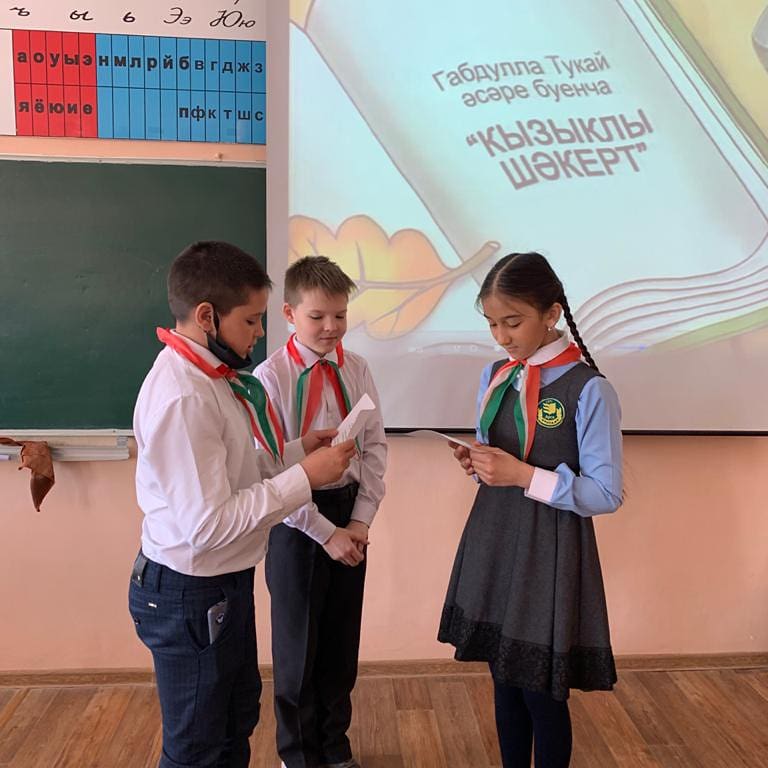 На классном часу ученики 4 класса (кл.руководитель Галимова Н.Р.) познакомились с биографией Г.Тукая. Посмотрели мультфильм снятый по мотивам стихотворения «Забавный ученик» (кызыклы шэкерт). После прочитали стихотворение по ролям, проигрывали ситуацию. Сыйныф сәгатендә 4 сыйныф укучылары (җитәкчесе Галимова Н.Р.) Г.Тукайның биографиясе белән таныштылар. «Кызыклы шэкерт" шигыре мотивлары буенча төшерелгән мультфильм карадылар. Соңыннан рольләр буенча шигырьләр укыдылар, ситуациядә җиңелделәр.