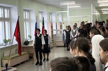 Право внести флаг было предоставлено победителям муниципального этапа олимпиады по литературе - ученице 11 класса Гарифзяновой К. и Иконниковой Л. ученица 9А класса