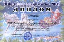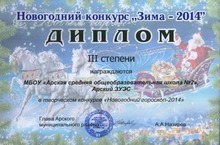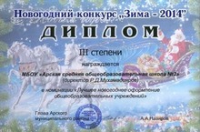 В преддверии Нового года традиционно все образовательные учреждения и предприятия г. Арск строили снежные фигуры. Наша школа в номинации "Лучшее новогоднее оформление общеобразовательных учреждений" удостоена Диплома III степени.