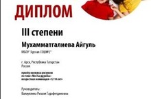 Стали известны результаты конкурса рисунков "Мосты дружбы" в рамках Международного Интернет-проекта "Мосты дружбы". Ученица 7 а класса Мухамматгалиева Айгуль удостоена Диплома III степени. Руководитель проекта Валиуллина Р.Г. Поздравляем!