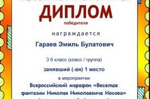 Стали известны итоги "Всероссийского марафона Николая Николаевича Носова". Ученик 3 б класса Гараев Эмиль (учитель Халиуллина Оксана Антатольевна) занял I место. Поздравляем с победой!