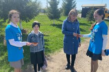 «Җиңү волонтерлары» иҗтимагый хәрәкәтендә катнашучылар шәһәр халкына котлау сүзләре белән мөрәҗәгать иттеләр һәм аларга Георгий тасмаларын тапшырдылар.