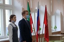 Начало новой учебной недели уже по традиции прошло с выноса флага и исполнения гимна РФ и РТ. Право вынести флаг дано активистам 11 класса, а также победителям районных олимпиад - Мифтахов Тимур, Мингазова Алсу.