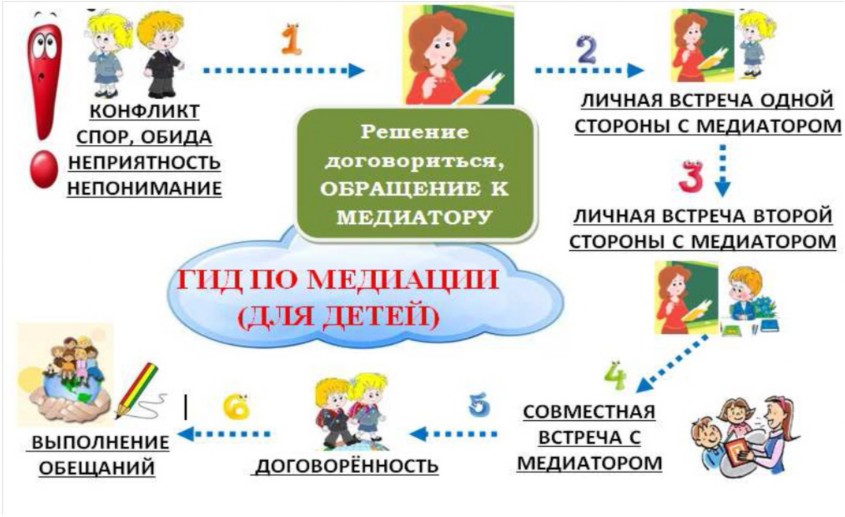 Служба медиации - это служба, созданная в образовательной организации и состоящая из учителей (или специалистов школы), обучающихся и их родителей, прошедших необходимую подготовку и обучение основам метода школьной медиации и медиативного подхода. Гид по медиации (для детей)