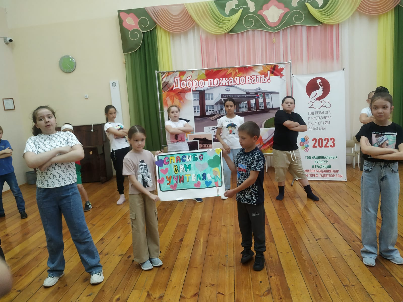 Работа в лагере начался с линейки и поднятия флагов под исполнение гимнов РФ и РТ. Сегодня в нашем лагере прошла акция "Спасибо учителю". где каждый отряд принял активное участие со своими выступлениями. Было очень приятно слушать каждого: кто подарил песню, кто-то готовил плакат с пожеланиями, а кто-то станцевал флешмоб. -