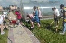 День мы, как обычно, начали с торжественной линейки, сообщили детям что мы будем делать на протяжении дня. Как позавтракали, мы с ребятами повторили технику безопасности, затем вышли на территорию школы. Девочки поливали деревья, а мальчики перетаскивали землю. После работы мы просмотрели художественный фильм о Великой Отечественной войне.