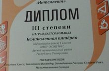Учащиеся 1А класса МБОУ АСОШ №6 Гасимова А., Зиятдинов И., Зиятдинова Р., Салихов Р., Мухаметзянова С. участвовали в Республиканском конкурсе среди команд школьников 1-5 классов "Интеллект" были награждены дипломом III степени, а руководитель команды школьников "Великолепная пятерка" Шакирова Ф.Ф. также награждена дипломом за подготовку и организационное сопровождение участников. Поздравляем! Желаем дальнейших успехов!