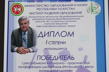 13 апреля ученики нашей школы Фасахиев Б., Мавлиев А., Минзин А., (руководители Файзуллин И.З., Ахметзянов М.А.) приняли участие в I республиканской научно-практической конференции школьников "Интеллект 21 века" имени В.И.Андреева, и заняли I место! Поздравляем! Желаем дальнейших успехов!