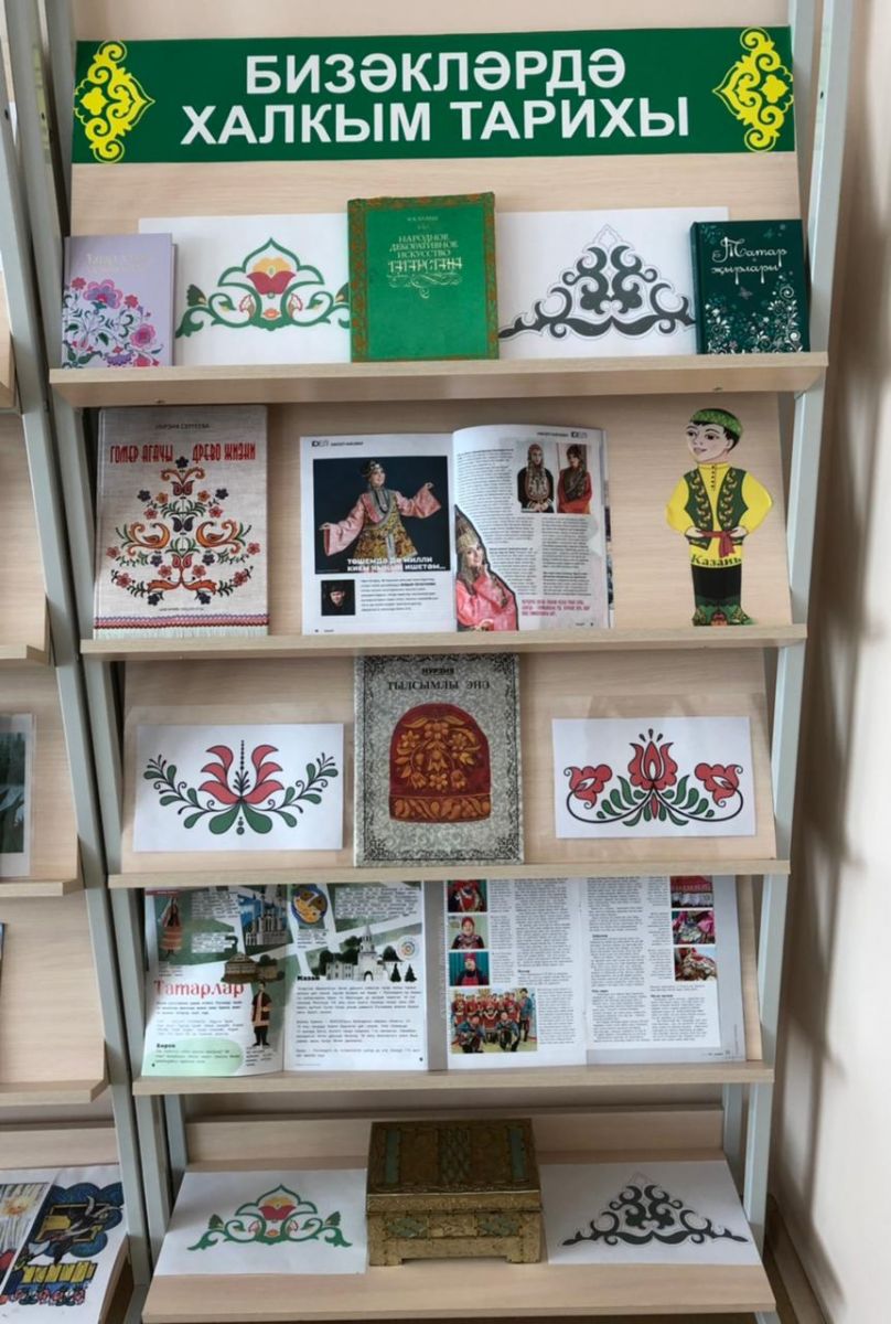 Туган телләр hәм халыклар бердәмлеге елы уңаеннан мәктәп китапханәсендә "Бизәкләрдә халкым тарихы" дип аталган китап күргәзмәсе эшли. Биредә укучыларыбыз татар халкының сәнгатье , милли җәуhәрләребез hәм аларның тарихлары белән таныша. -