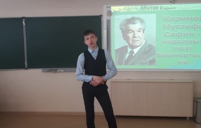 Туган телләр һәм халыклар бердәмлеге елы кысаларында 8Б классы укучылары башкорт шагыйре Мостай Кәримнең шигырьләрен яттан укыдылар. -