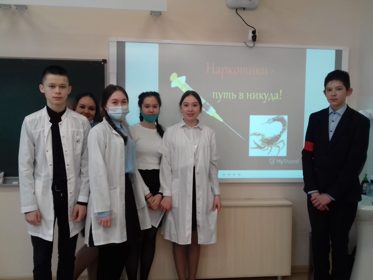 В рамках акции "Сообщи, где торгуют смертью" в 10А классе (руководитель Загидуллина Г.Р.) был проведён классный час в форме беседы-диспута. Учащиеся разделились на три группы: "Врачи", "Выпускники мединститута", "Абитуриенты". Каждая группа подготовила сообщение "Наркотики - путь в никуда". В группе "Врачи" выступали учащиеся, выбравшие профессию медика. Беседа проведена в рамках изъяснительной работы о вреде наркотических средств. -