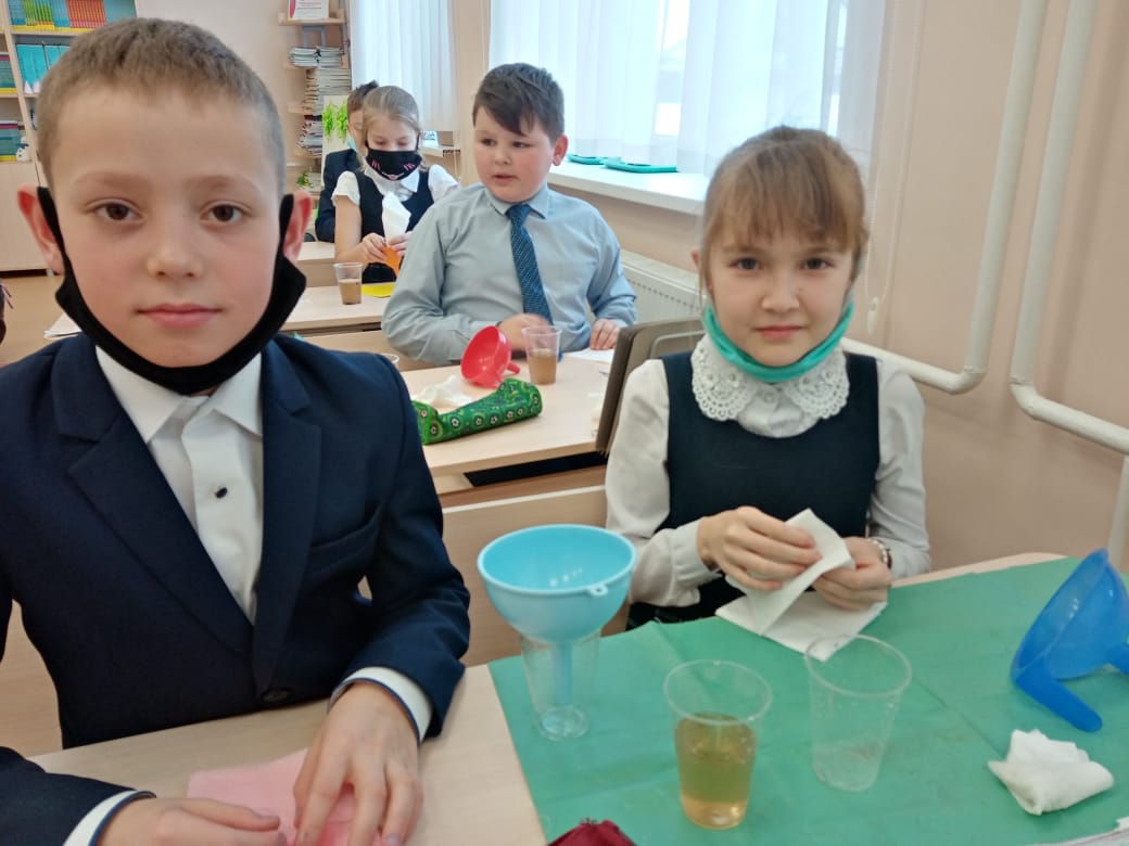 На уроке технологии ученики 4 б класса изготовили фильтр и сделали вывод, как он поможет нам очистить воду. -