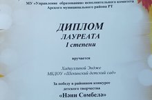 "Нәни Сөмбелә" бәйгесендә катнашып, безнең балалар бакчасыннан Хадиуллина Энҗе I дәрәҗә диплом белән бүләкләнде.