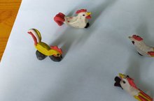 Формировать умение создавать коллективными усилиями несложную сценку из вылепленных фигур.Закреплять умение лепить петуха ,кур.цыплят.Добиваться большей точности в переда основной формы,характерных деталей.