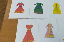 Программное содержание : Учить детей изображать форму платье,их расположение,относительную величину.Упражнять в красивом расположении изображения на листе бумаги и аккуратном наклеивании.Развивать умение подбирать бумагу для частей одежды,красиво сочетающуюся по цвету.Учить создавать крупное изображение.