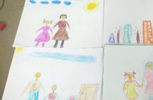 Цель :Закреплять умение рисовать фигуру человека ,передав относительную величину ребёнка и взрослого.Развивать умение располагать изображения на листе в соответствии с содержанием рисунка.Упражнять в рисовании контура простым карандашом и последующем закрашивании цветными карандашами.
