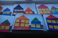 Цель: Учить детей создавать несложную композицию: по-разному располагать на пространстве листа изображения домов, дополнительные предметы. Закреплять приемы вырезывания и наклеивания, умение подбирать цвета для композиции. Развивать творчество, эстетическое восприятие.