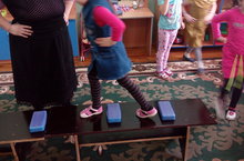 1) упражнять в сохранении равновесия при ходьбе по повышенной опоре с выполнением дополнительного задания, закреплять навык энергичного отталкивания от пола в прыжках;