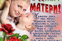 С Днем Матери!!! 29.11.2015 День матери — праздник каждой женщины, любящих своих детей преданной любовью и положивших все силы на их воспитание. Подарим своих матерям радость и проведём этот день с нашими любимыми мамами, которые так рады любому проявлению внимания со стороны своих любимых детей. Забудем в этот день все несогласия и конфликты и прижмём матерей к своей груди.