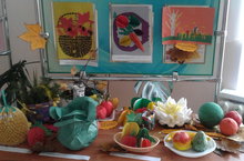 Башлангыч класс укучылары Уңыш бәйрәменә кәгазьдән бик матур итеп ясалган яшелчә һәм җиләк-җимешләрдән күргәзмә әзерләделәр.