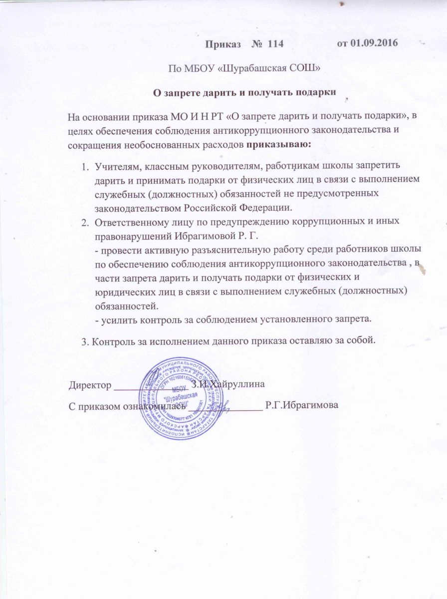 Приказ №114 О запрете дари ть и получать подарки)