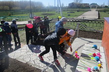 hәйкәл янында! 07.05.2015 Балалар белән сугышта һәлак булганннарның истәлегенә куелган һәйкәлгә чәчәкләр салдык. Балалар белән бу корбаннарны хөрмәтләү, сугыш геройлары белән горурлану хисләре уятуга юнәлтелгән әңгәмә уздырылды