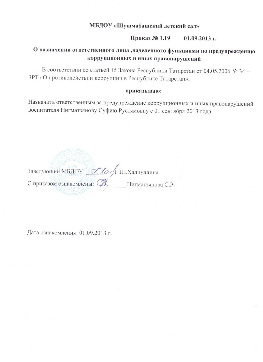 Выписка из приказа «Об ответственных за организацию антикоррупционной деятельности в МБДОУ»