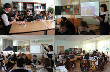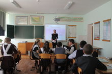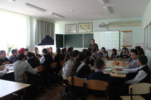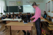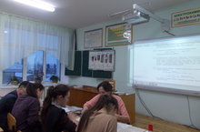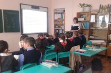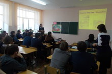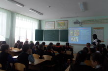 Табигать фәннәре атналыгы кысаларында 11класс укучылары түбәнрәк класс укучылары арасында дәресләр үткәрделәр. Фотода 11 класс укучысы Нургалиева Алия 8 класста химиядән дәрес үткәрә.