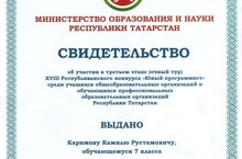 Наш ученик: Каримов Камиль(руководитель-учитель информатики Нуризянов Э.Т.) успешно выступил в республиканском туре XVIII республиканском конкурсе "Юный программист-2014" среди учащихся общеобразовательных школ и обучающихся учреждений среднего профессионального образования на базе ДОКЛ «Байтик». Поздравляем!