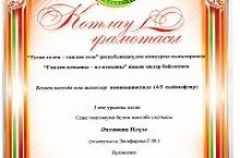 "Туган телем - гаиләм теле" республикакүләм конкурсы кысаларында "Гаиләм язмышы-ил язмышы" иҗади эшләр бәйгесенең "Безнең нәселдә олы шәхесләр" номинациясендә (4-5 сыйныфлар) 3нче урынны алган Илүзә Әхтәмова Арча районы мәгариф идарәсенең Котлау грамотасы белән бүләкләнде Укытучысы-Гөлнур Загафарова.