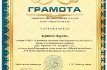 Зарипов Наркиз - лауреат республиканского этапа конкурса "Добрый волшебник" XVI Международного фестиваля "Детство без границ", награжден Грамотой Министерства образования и науки Республики Татарстан (рук. Зарипова З.В., Закирова С.Р.). Искренне поздравляем победителя!