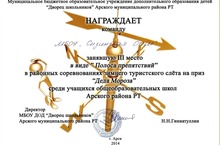 Команда нашей школы заняла 3 место в виде "Полоса препятствий" в районном туристском слете на приз "Деда Мороза" среди учащихся общеобразовательных школ Арского района РТ и награждена Дипломом МБОУ дополнительного образования детей "Дворец школьников" Арского муниципального района РТ