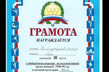 Ученик 7 класса Залялутдинов Эльмар занял 3 место в отборочном турнире по вольной борьбе среди юношей 1998-99 г.р. в весовой категории 38 кг. Искренне поздравляем победителя.