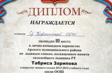 1 март көнне Арча шәһәре стадионында көчле чаңгычы Тәбрис Зарипов истәлегенә чаңгы ярышы булып узды. Мәктәпнең яшь спортчылары (җитәкчеләре - Минһаҗев М.В.) әлеге ярышта сынатмадылар. Нәтиҗәләр түбәндәгечә: Сәләхова Фәнүзә - 1 урын, Яруллин Илназ - 3 урын, Мөхәммәдиев Илмир - 4 урын. Мәктәп командасы бу ярышта 3 урынны алды. Җиңүчеләрне котлыйбыз!